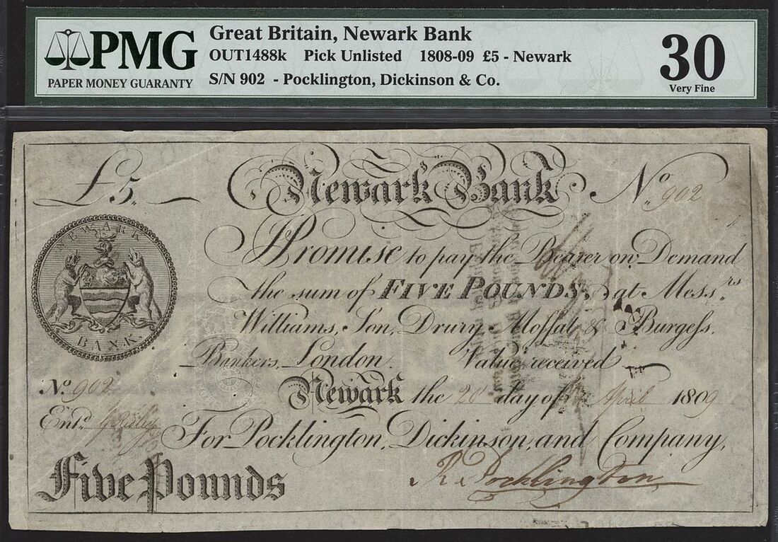 Newark Bank, Great Britain, £5, 1809, serial number 902, (Pick unlisted, Outing 1488k), in PMG holder 30 Very Fine