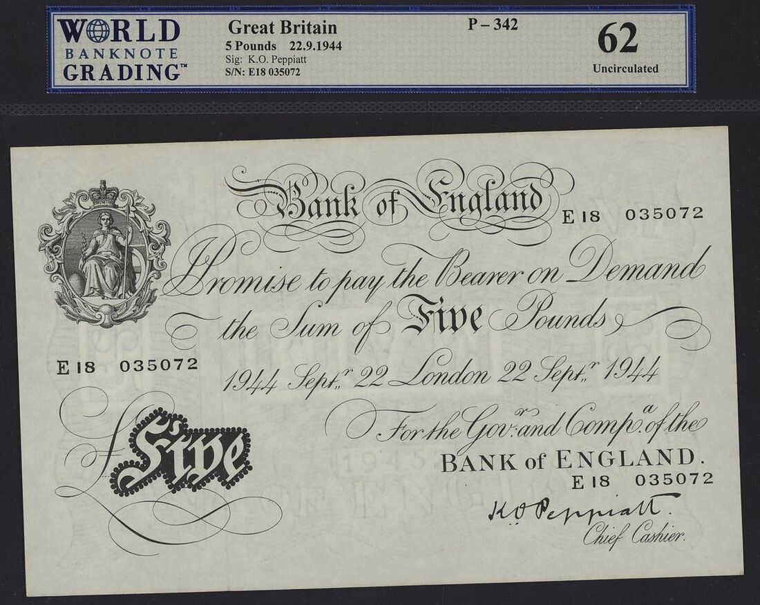 (x) Bank of England, K. O. Peppiatt, £5, 22nd September 1944, serial number E18 035072, (EPM B241, Pick 342), in WBG holder 62 Uncirculated