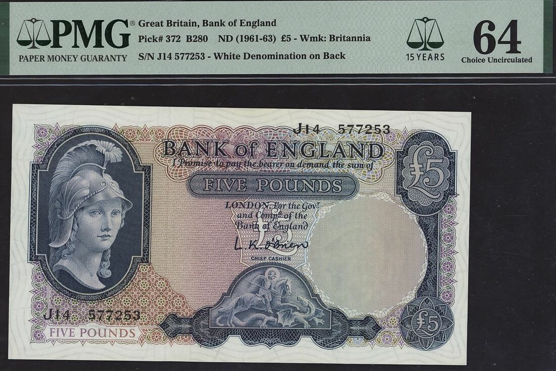 Bank of England, L. K. O'Brien, £5, ND (1961-1963), serial number J14 577253, (EPM B280, Pick 372), in PMG holder 64 Choice Uncirculated