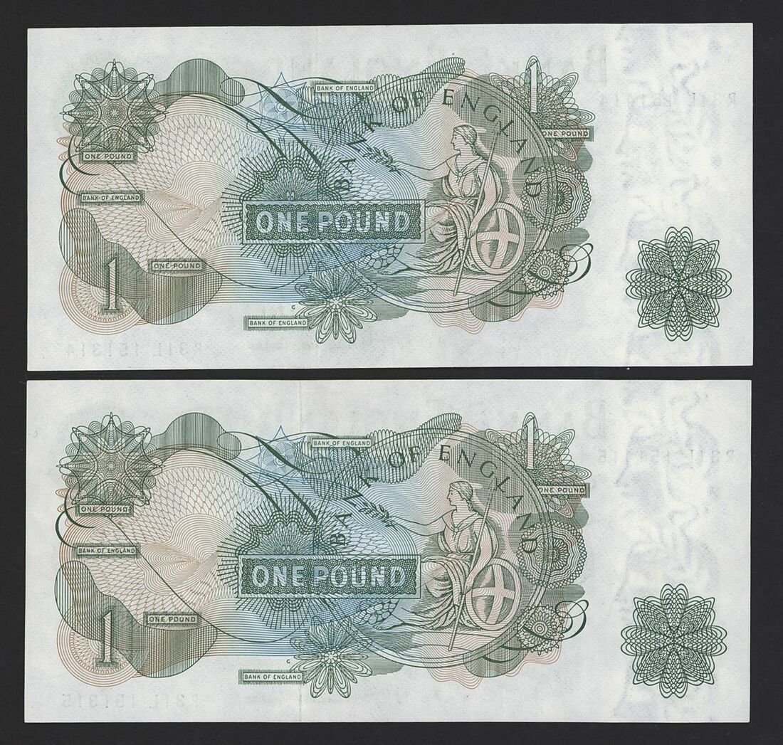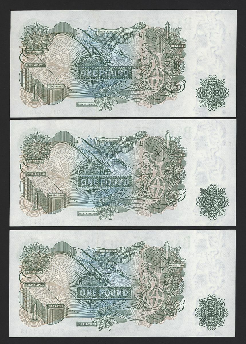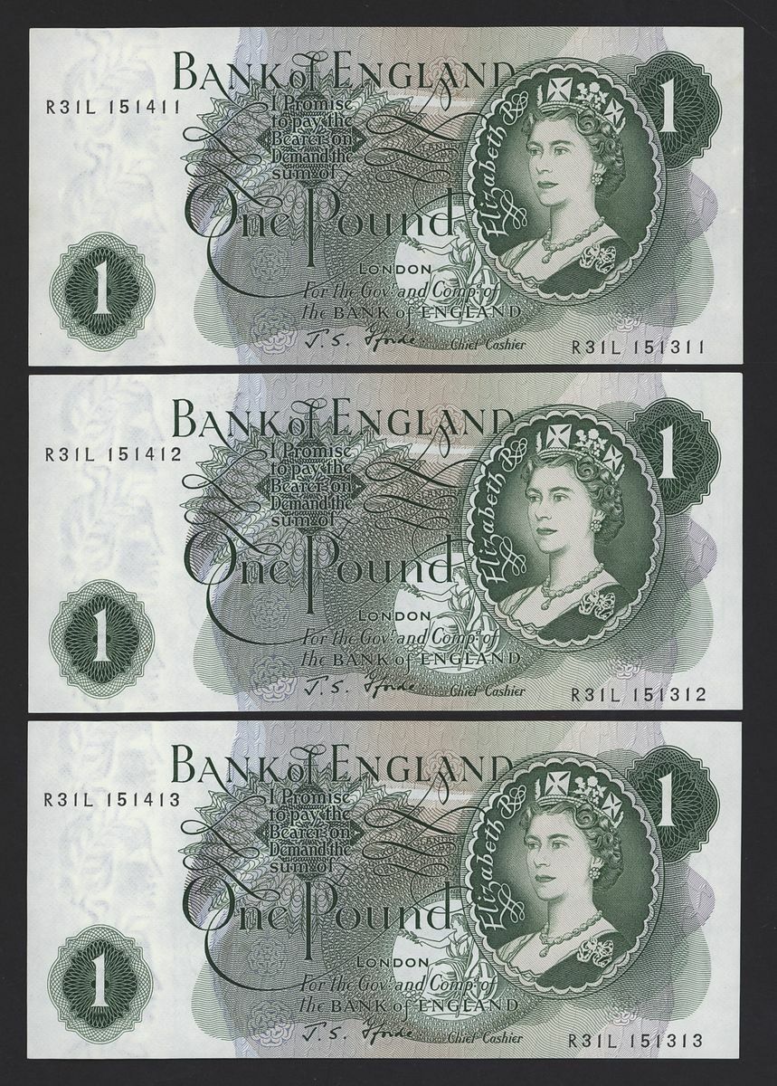 Bank of England, J. S. Fforde, consecutive error £1 (5), ND (1967), consecutive serial numbers R31L 151311-5 and 151411-5, different serial numbers on the same note