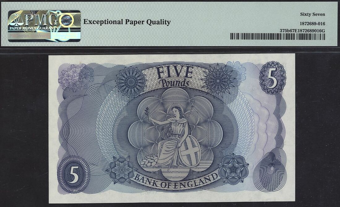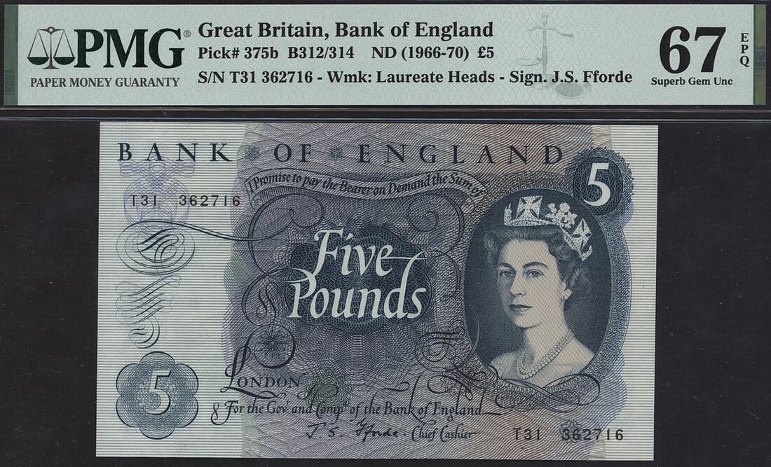 Bank of England, J. S. Fforde, £5, ND (1967), serial number T31 362716, (EPM B312), in PMG holder 67 EPQ Superb Gem Uncirculated