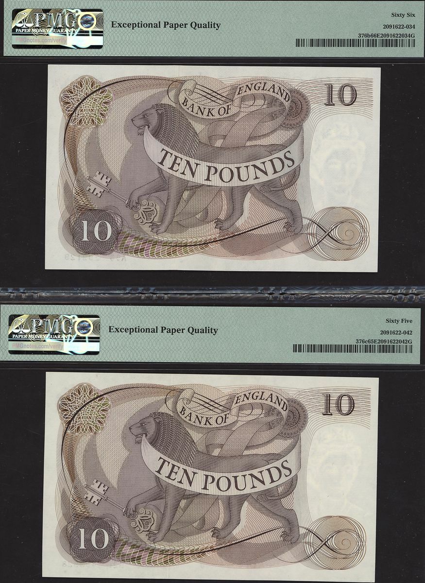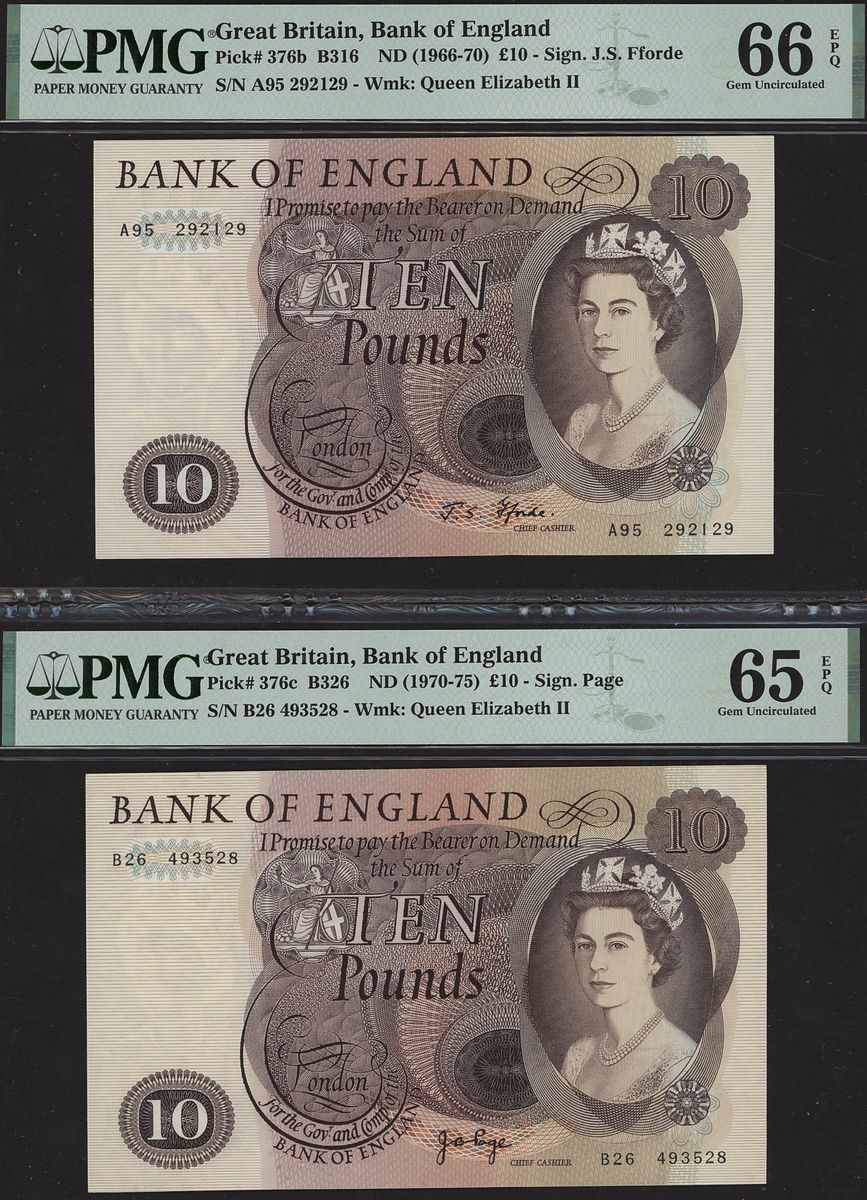 (x) Bank of England, J. S. Fforde, a pair of £10, ND (1966-70), ND (1970-75), (EPM B316, B326), in PMG holder 66 EPQ Gem Uncirculated, 65 EPQ Gem Uncirculated, (2 notes)