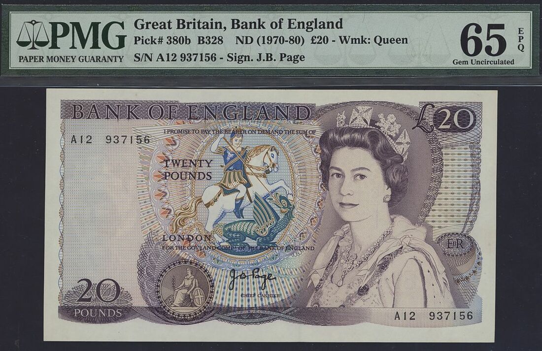 (x) Bank of England, J. B. Page, £20, ND (1970-80), serial number A12 937156, (EPM B328), in PMG holder 65 EPQ Gem Uncirculated