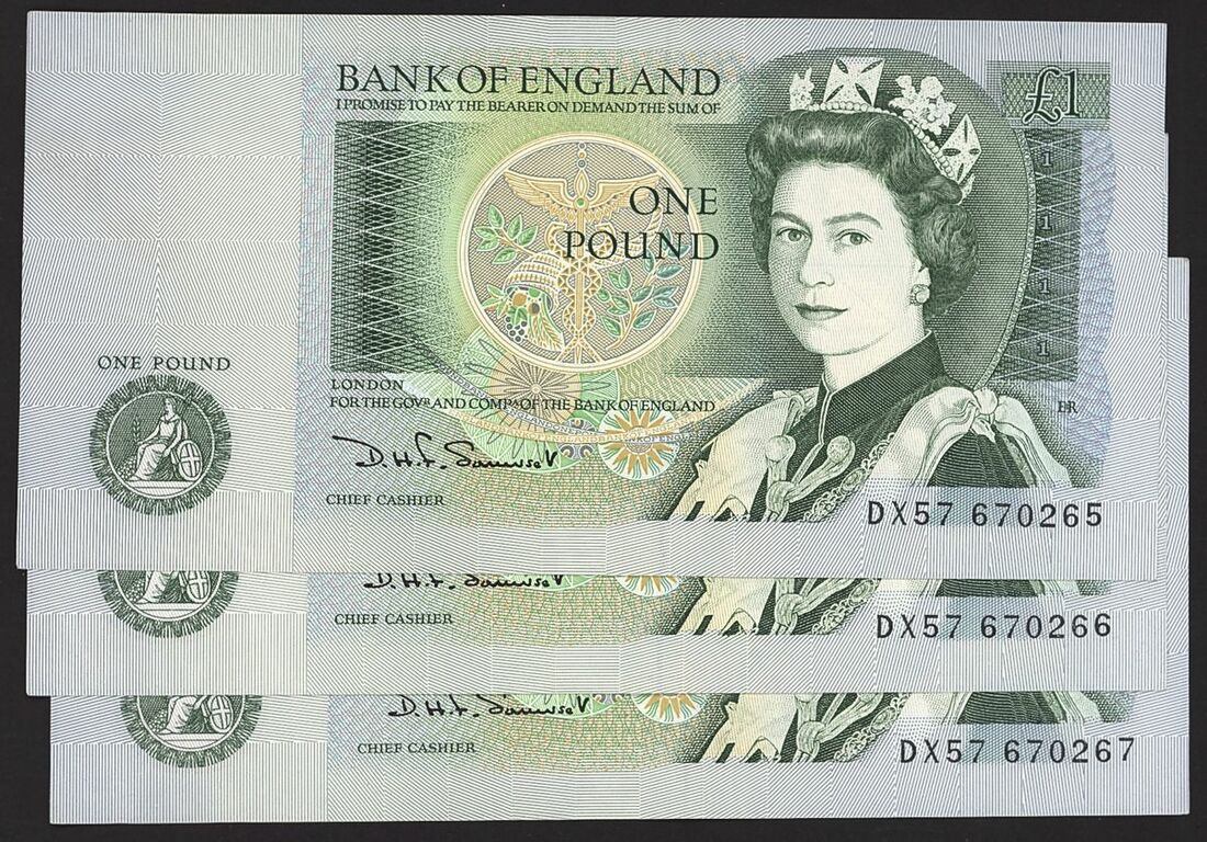 Bank of England, D. H. F. Somerset, £1 (3), ND (1981), consecutive serial numbers DX57 670265-7, (EPM B341), very fine, very slight staining on obverse of first note, with small mark on reverse of first and second note