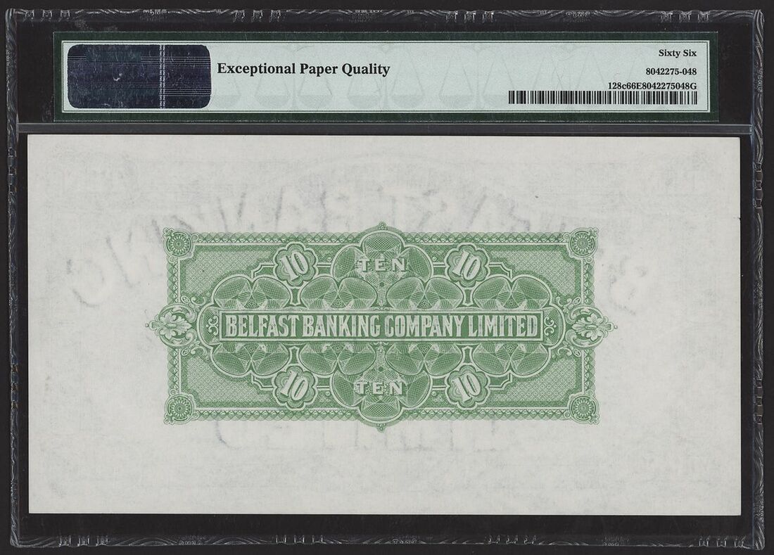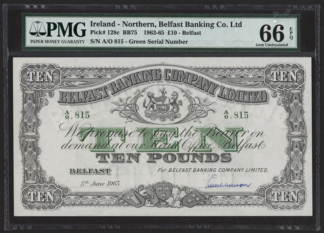 (x) Belfast Banking Company, Northern Ireland, £10, 5th June 1965, serial number A/O 815, (Pick 128c), in PMG holder 66 EPQ Gem Uncirculated, only 1 note in a higher grade
