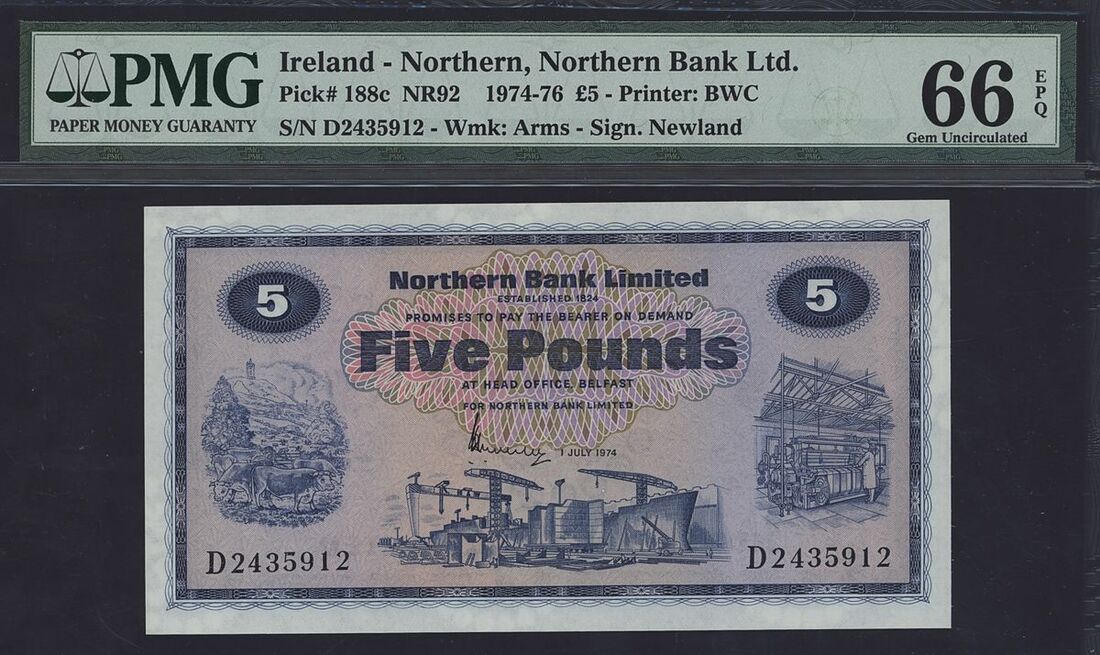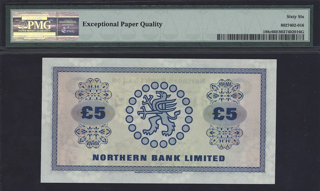 (x) Northern Bank, Northern Ireland, £5, 1st July 1974, serial number D2435912, (PMI NR92), in PMG holder 66 EPQ Gem Uncirculated