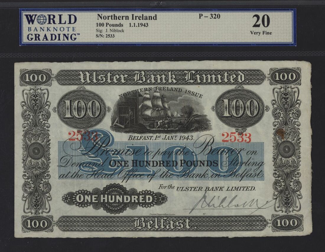 (x) Ulster Bank, Northern Ireland, £100, 1st January 1943, serial number 2533, (PMI UB61), in WBG holder 20 Very Fine