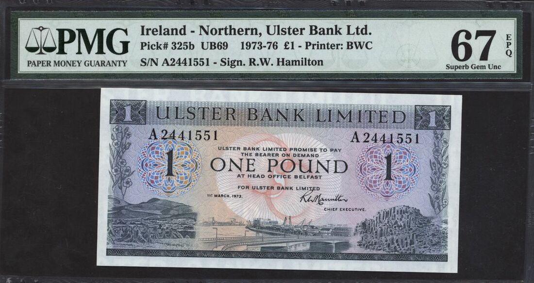 (x) Ulster Bank, Northern Ireland, £1, 1st March 1973, serial number A2441551, (PMI UB69), in PMG holder 67 EPQ Superb Gem Uncirculated
