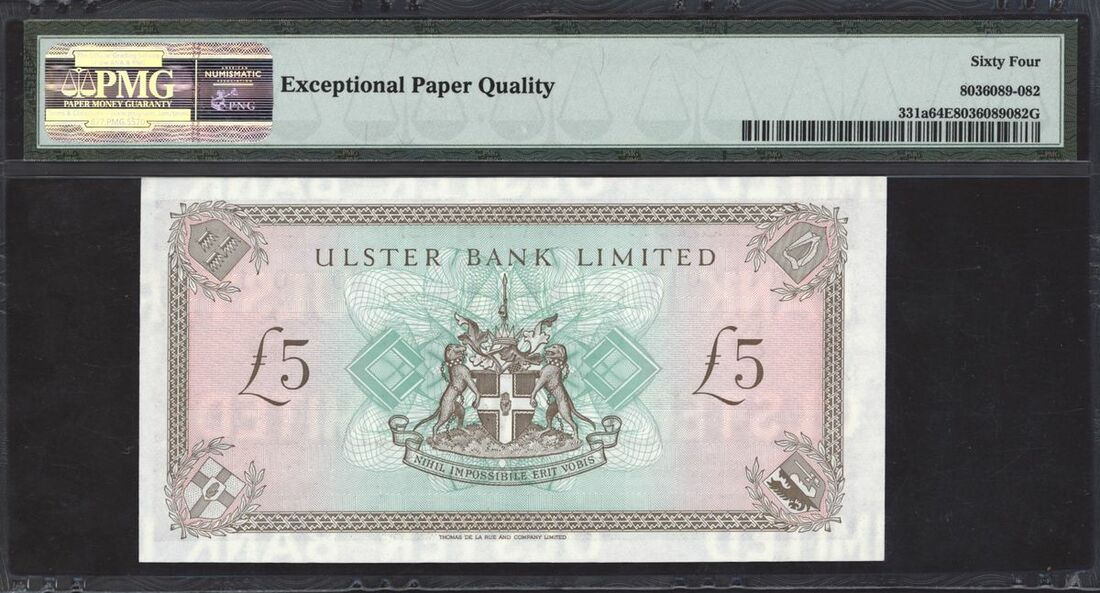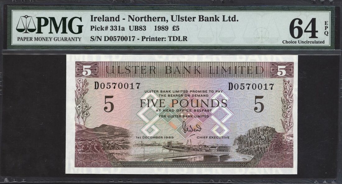 (x) Ulster Bank, Northern Ireland, £5, 1st December 1989, serial number D0570017, (PMI UB83), in PMG holder 64 Choice Uncirculated