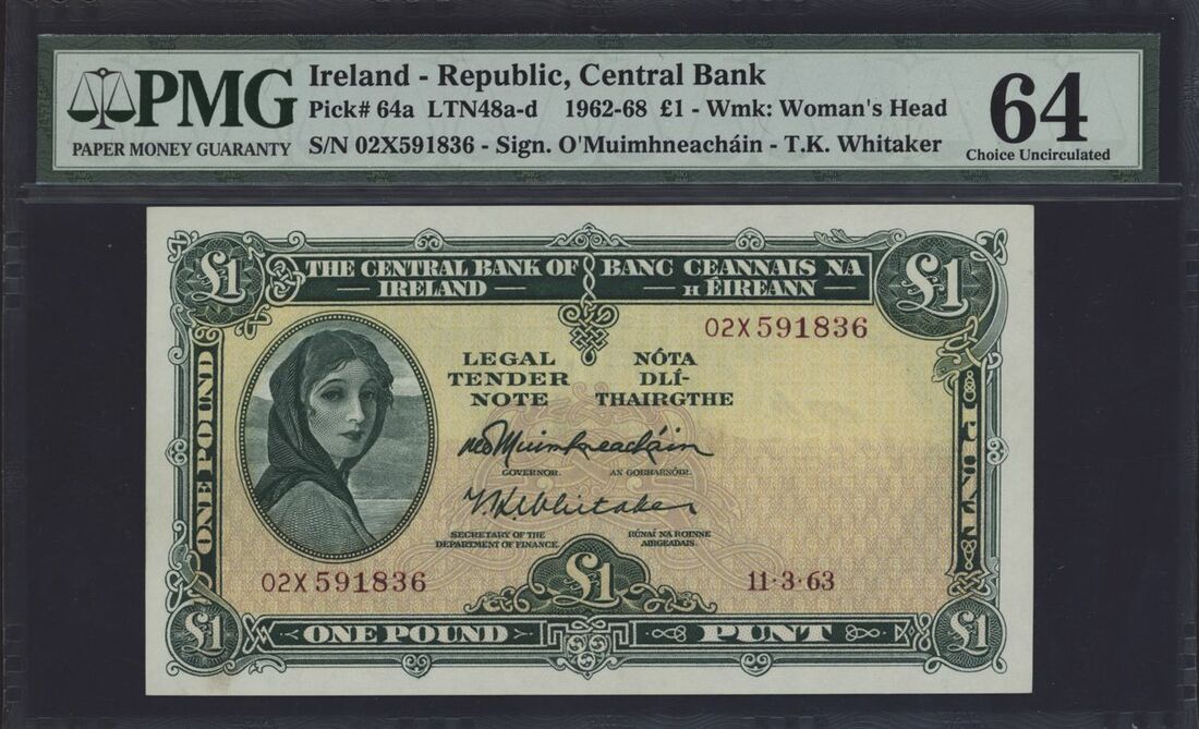 (x) Central Bank of Ireland, £1, 11th March 1963, serial number 02X591836, (PMI LTN48a-d), in PMG holder 64 Choice Uncirculated, minor substance