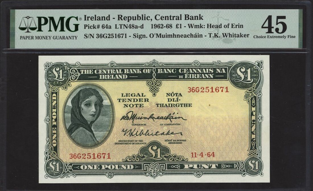 (x) Central Bank of Ireland, £1, 11th April 1964, serial number 36G251671, (PMI LTN48a-d), in PMG holder 45 Choice Extremely Fine