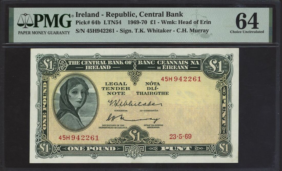 (x) Central Bank of Ireland, £1, 23rd May 1969, serial number 45H942261, (PMI LTN54), in PMG holder 64 Choice Uncirculated