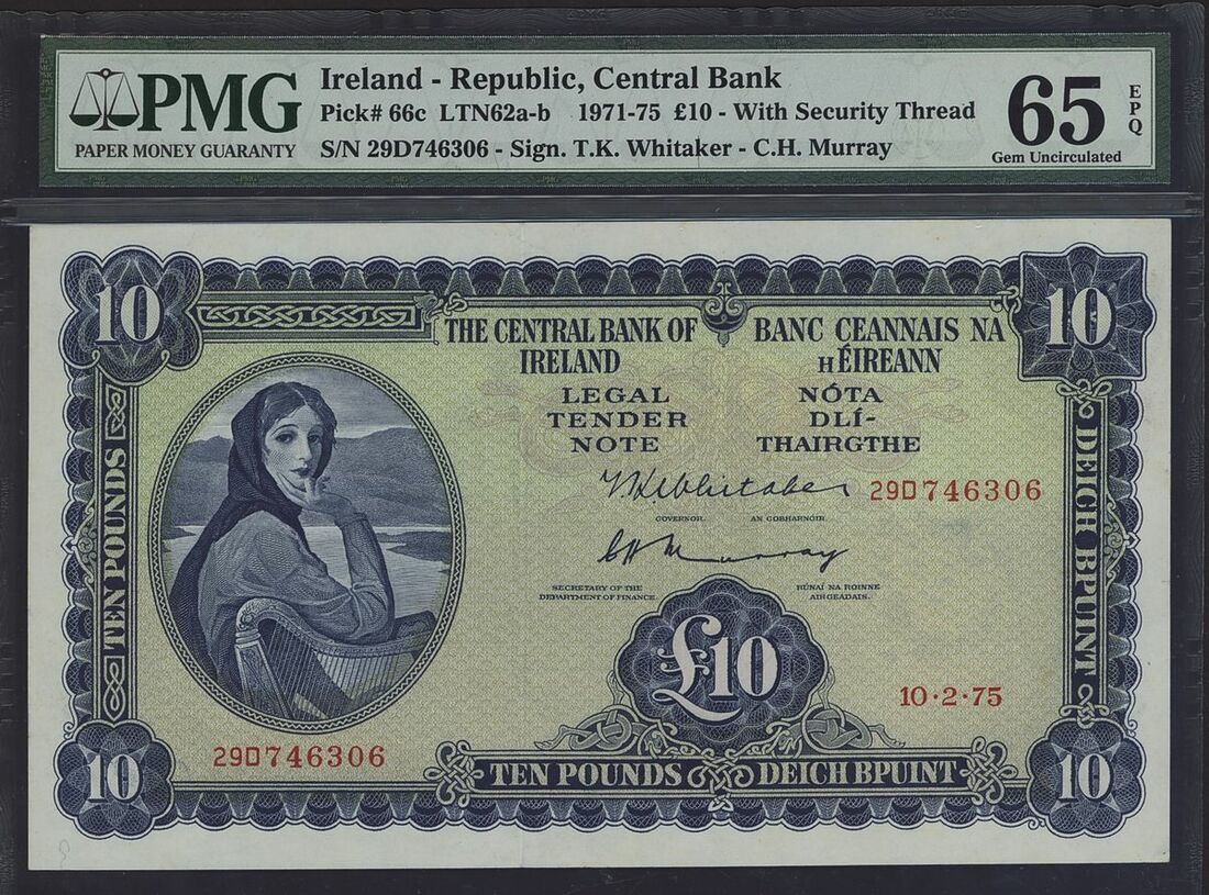 (x) Central Bank of Ireland, £10, 10th February 1975, serial number 29D746306, (PMI LTN62a), in PMG holder 65 EPQ Gem Uncirculated