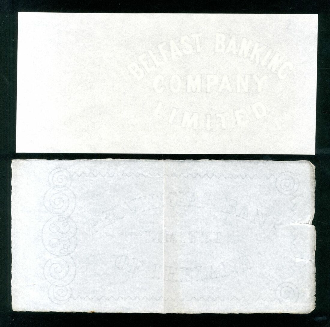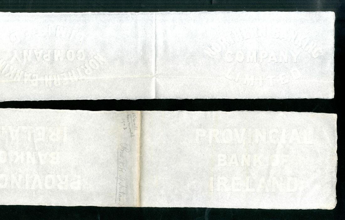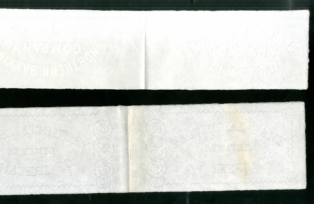 A group of watermark paper from Irish banks, ND (1900s), including Belfast Banking Company Limited (a sheet of 6, a sheet of 1), Provincial Bank of Ireland (two sheet of 2 and a sheet of 1), Northern Bank (a sheet of 2), Northern Banking Company (two sheet of 2), Ulster Bank (a sheet of 6),