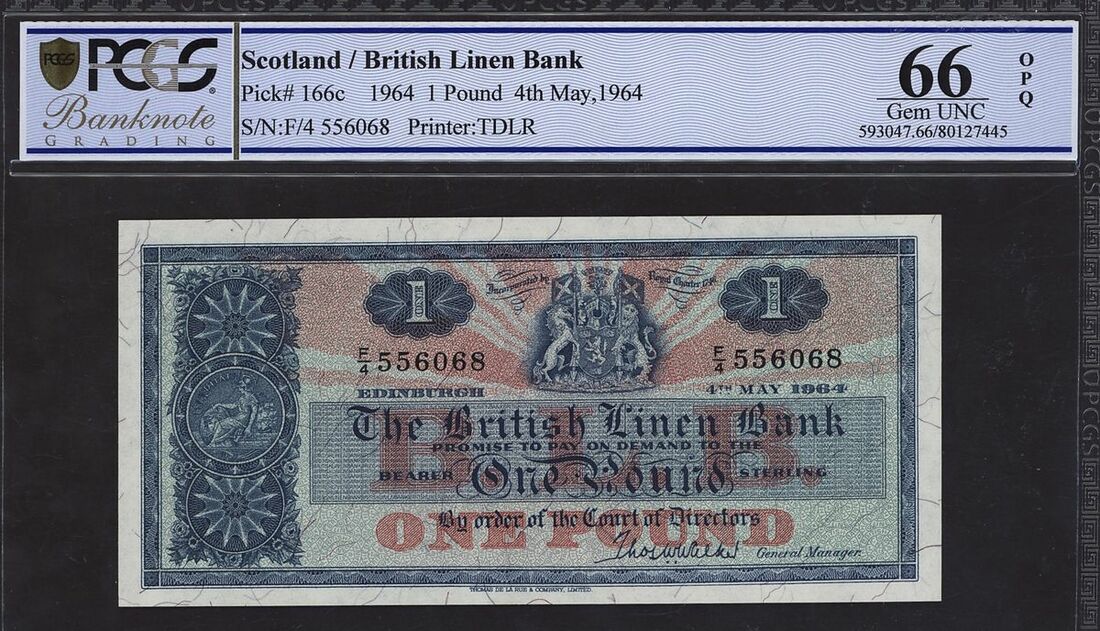 (x) British Linen Bank, Scotland, £1, 4th May 1964, serial number F/4 556068, (PMS BL71b), in PCGS holder 66 OPQ Gem Uncirculated