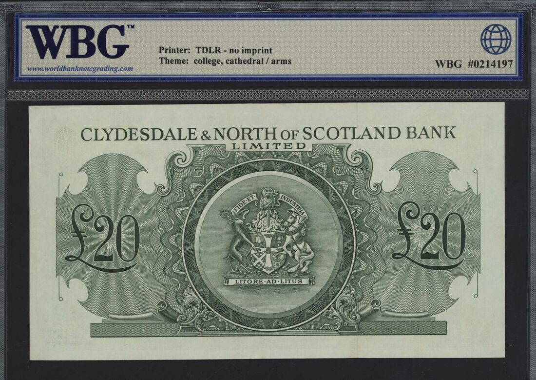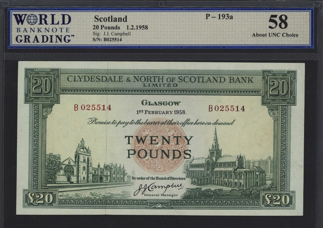 (x) Clydesdale & North of Scotland Bank, £20, 1 February 1958, serial number B025514, (CL26a, Pick 193a), in WBG holder 58 About UNC Choice, high grade