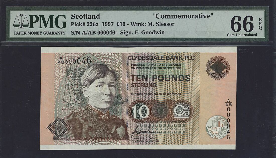 (x) Clydesdale Bank, Scotland, commemorative £10, 1st May 1997, serial number A/AB 000046, (PMS CL51a), in PMG holder 66 EPQ Gem Uncirculated