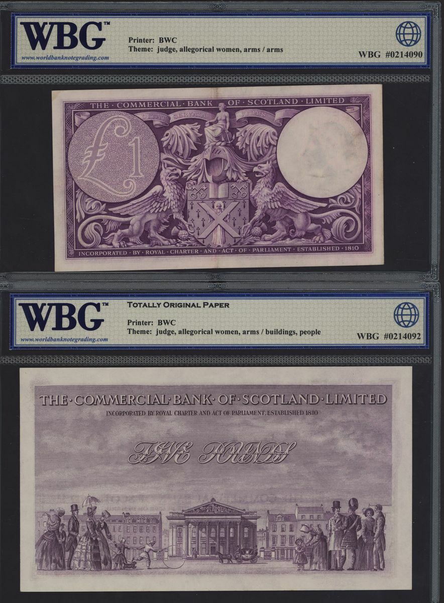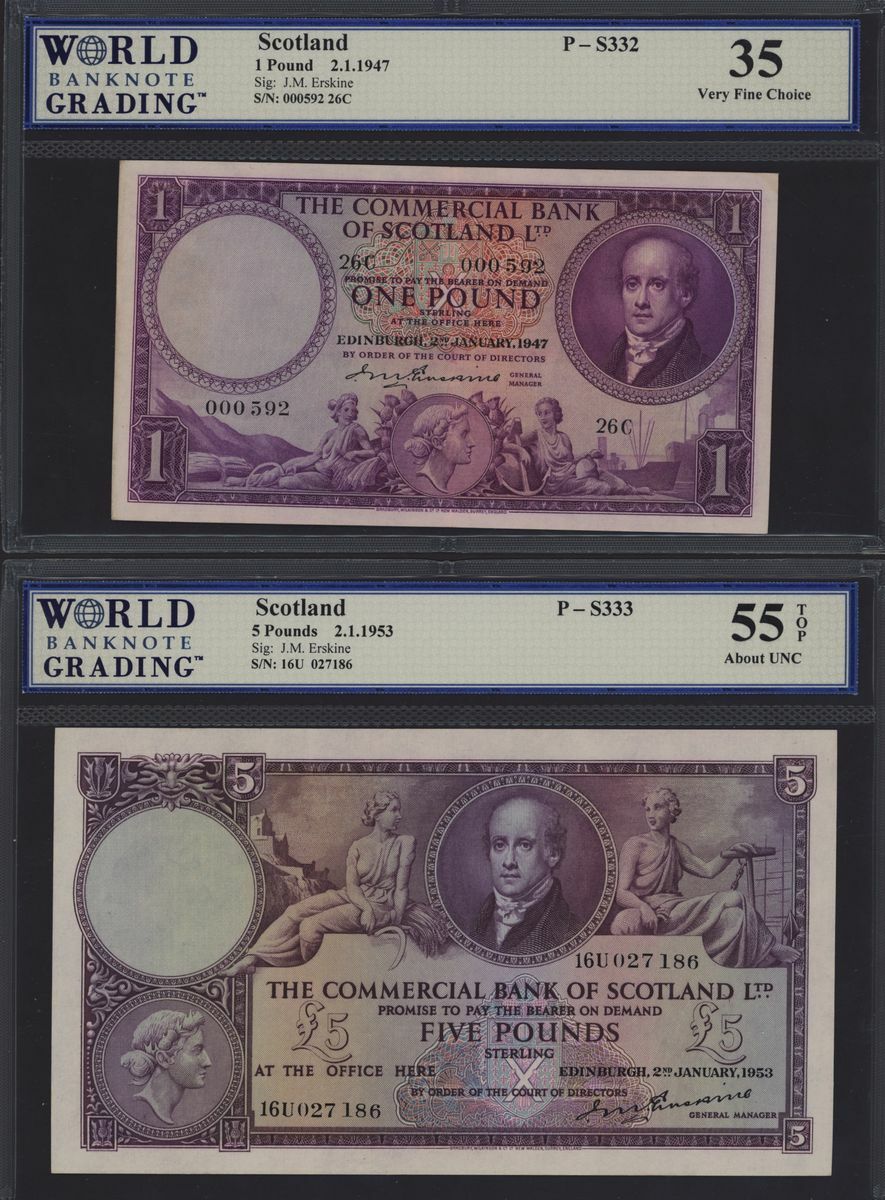 (x) Commercial Bank of Scotland, £5, 2 January 1953, serial number 16U 027 186, also £1, 1947,