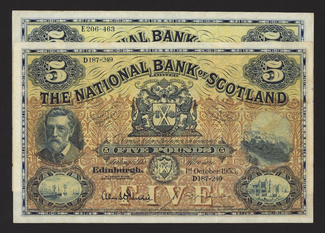 (x) National Bank of Scotland, a pair of £5, 1st October 1953, serial number D187-249, 1st December 1955, serial number E206-463, (PMS NA57, NA58), very fine, spotting on 1955