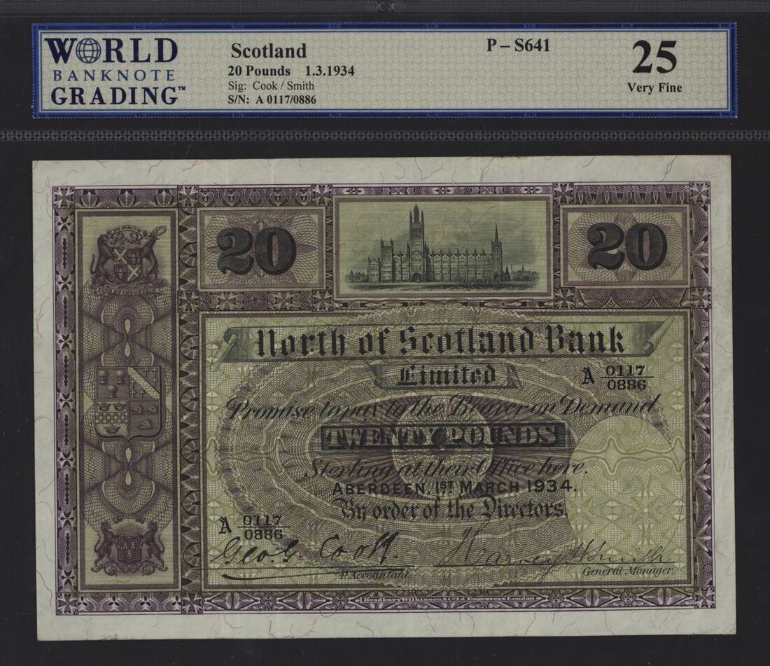 (x) North of Scotland Bank, £20, 1st March 1934, serial number A 0117/0886, (PMS NS41), in WBG holder 25 Very Fine, scarce
