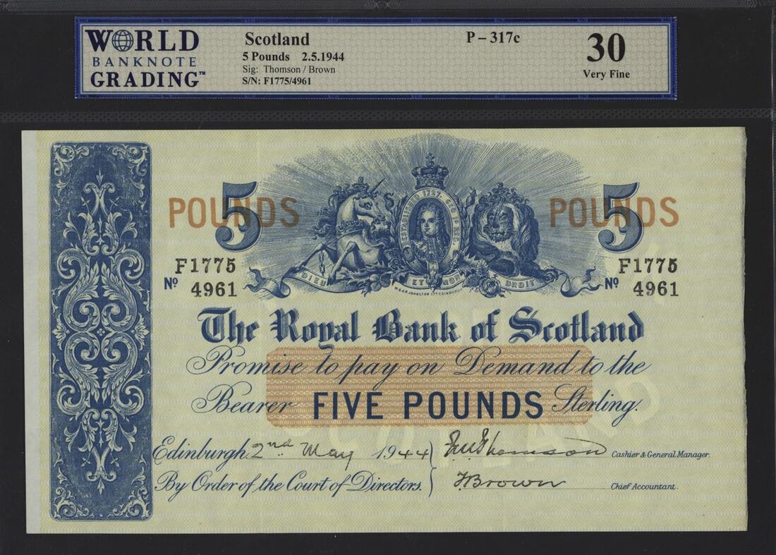 (x) Royal Bank of Scotland, £5, 2nd May 1944, serial number F1775/4691, (PMS RB57h), in WBG holder 30 Very Fine