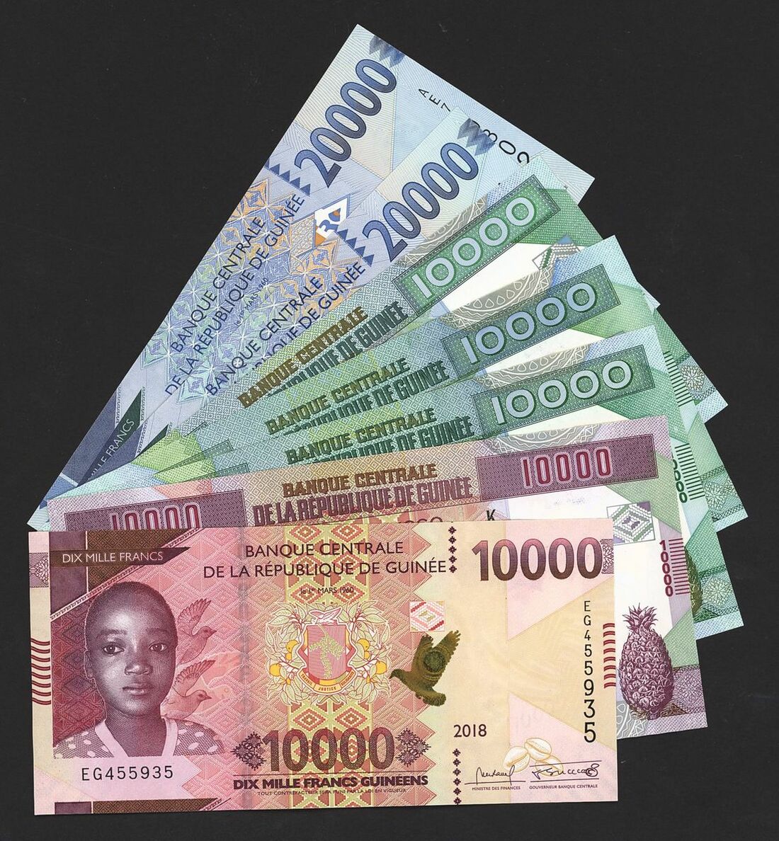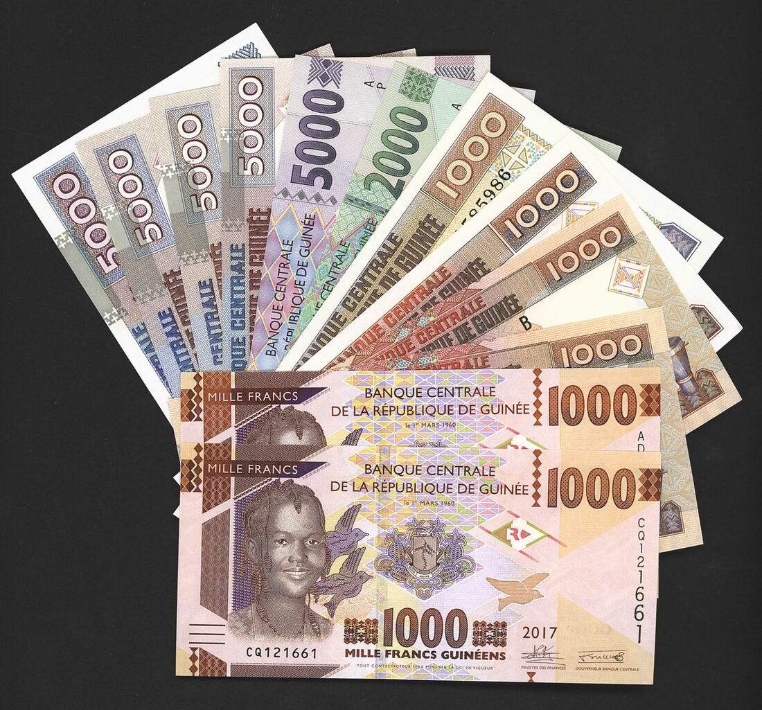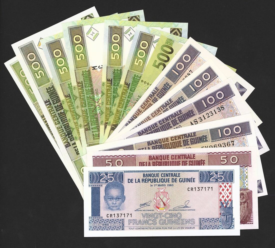 Guinea, a group of notes, 25 francs (1), 50 francs (1), 100 francs (4), 500 francs (7), 1000 francs (6), 2000 francs (1), 5000 francs (5), 10,000 francs (5), 20,000 francs (2)
