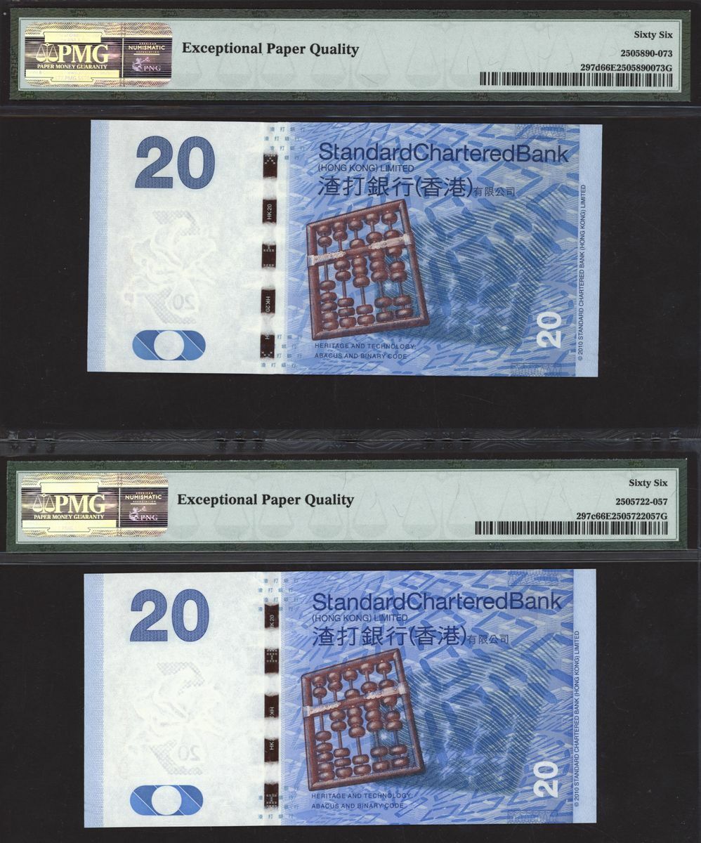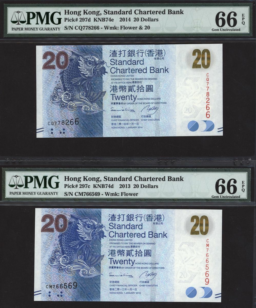 (x) Standard Chartered Bank, Hong Kong, a pair of $20, 2013, serial number CM766569, 2014, serial number CQ778266, (Pick 297c, 297d), in PMG holder 66EPQ Gem Uncirculated