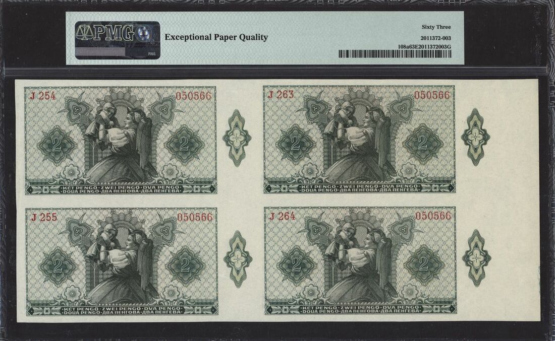 (x) Magyar Nemzeti Bank, Hungary, uncut block of 4 2 pengo, 1940, serial numbers J254-5 / 63-4 050566, (Pick 108a), in PMG holder 63 EPQ Choice Uncirculated