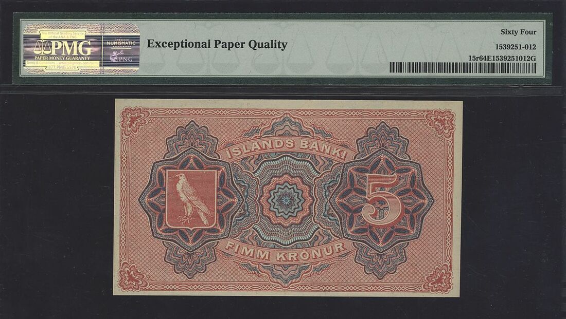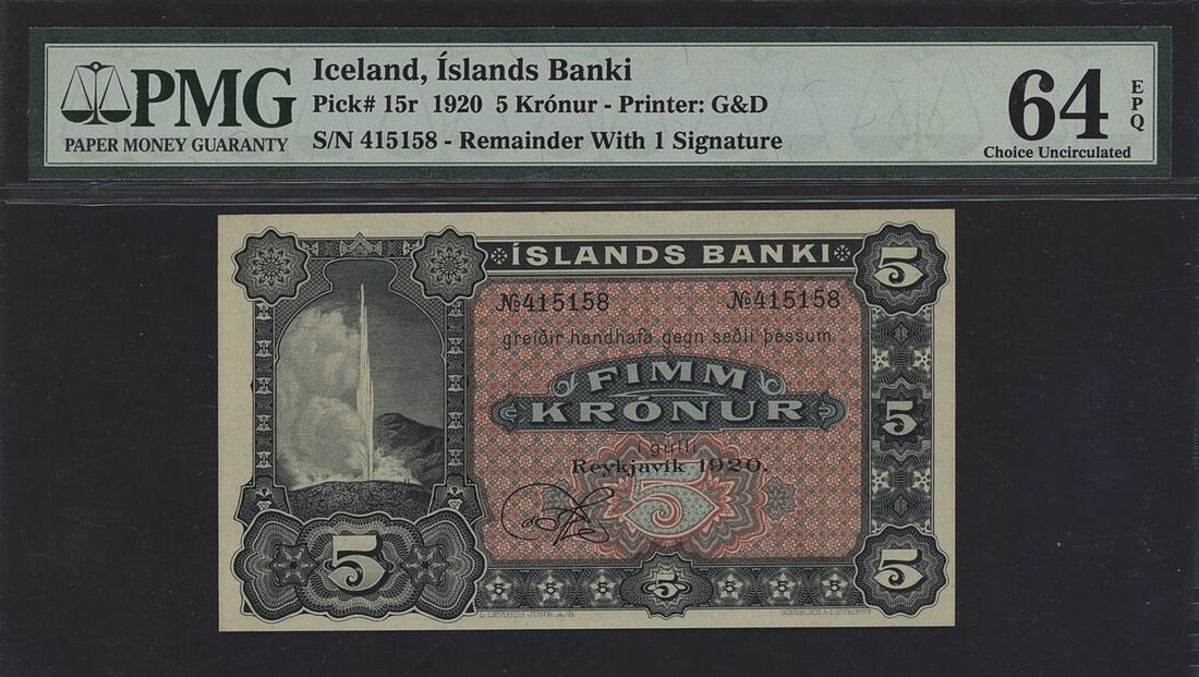 (x) Islands Banki, Iceland, 5 kronur, 1920, serial number 415158, (Pick 15r), in PMG holder 64 EPQ Choice Uncirculated
