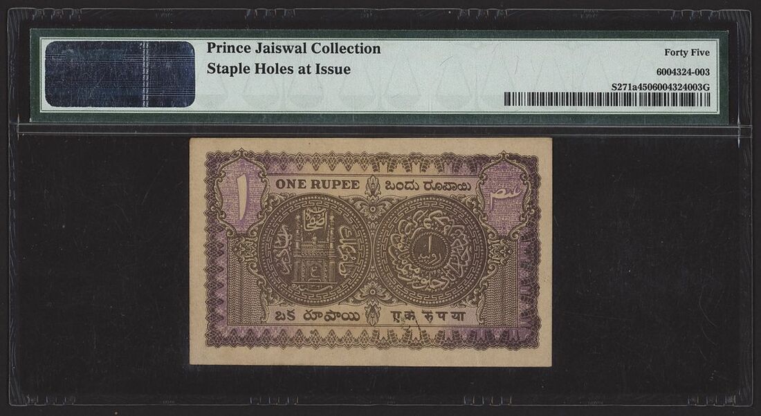 (x) Princely States / Hyderabad, India, 1 rupee, ND (1941-45), serial number F/3 993585, (Pick S271a), in PMG holder 45 Choice Extremely Fine, Prince Jaiswal Collection, staple holes at issue