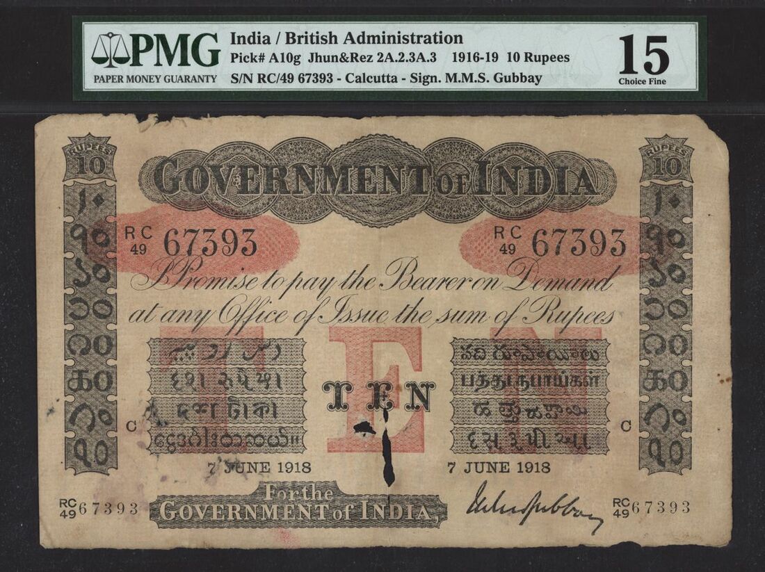 (x) Government of India, 10 rupees, 7th June 1918, serial number RC/49 67393, (Pick A10g), in PMG holder 15 Choice Fine