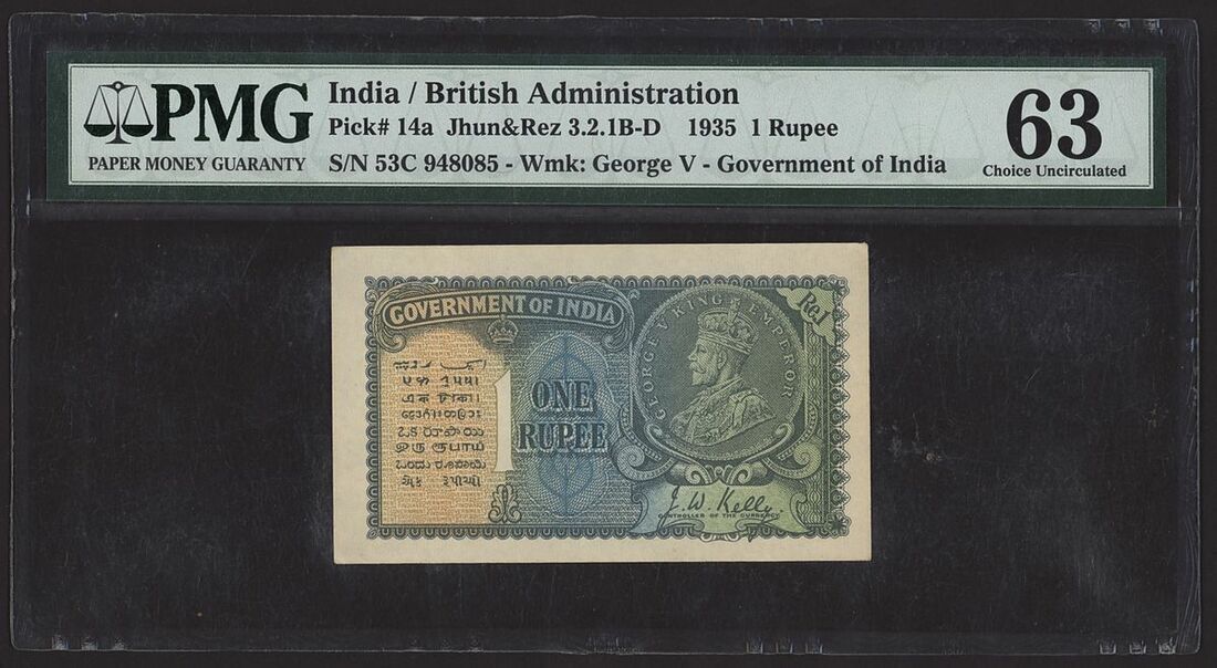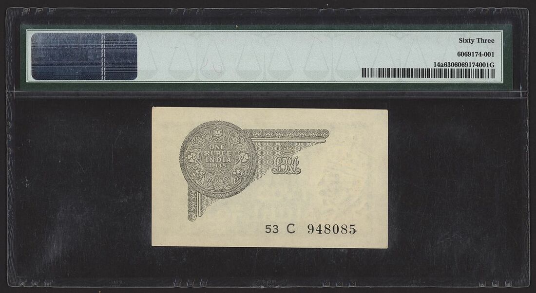 (x) Government of India, 1 rupee, 1935, serial number 53C 948085, (Pick 14a), in PMG holder 63 Choice Uncirculated