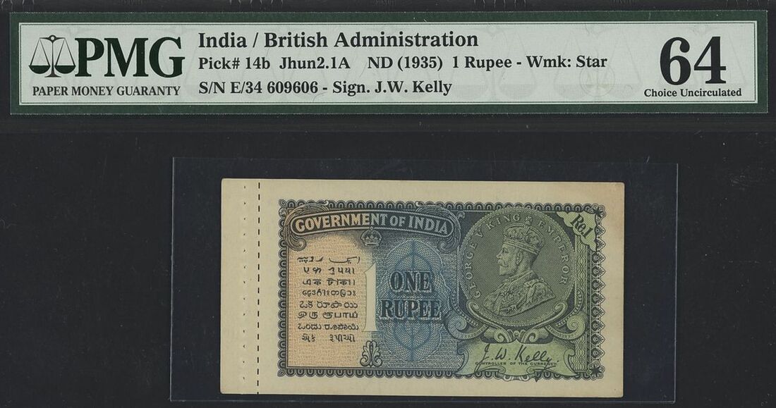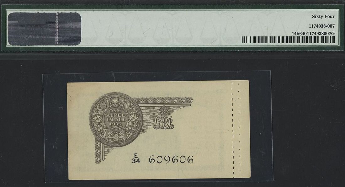 (x) Government of India, 1 rupee, ND (1935), serial number E/34 609606, (Pick 14b), in PMG holder 64 Choice Uncirculated