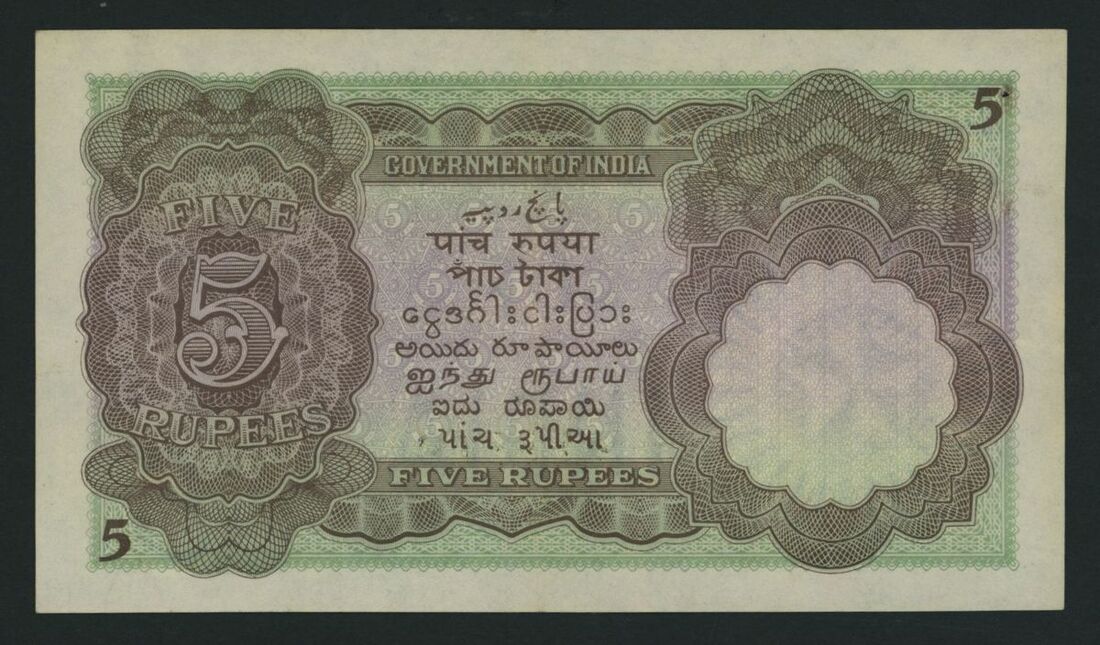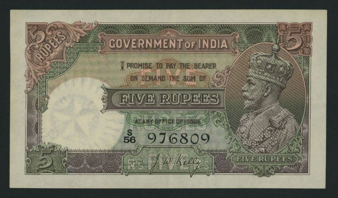 Government of India, 5 rupees, ND 1933, serial number S56 976809, (Pick 15b, BNB 149), good very fine