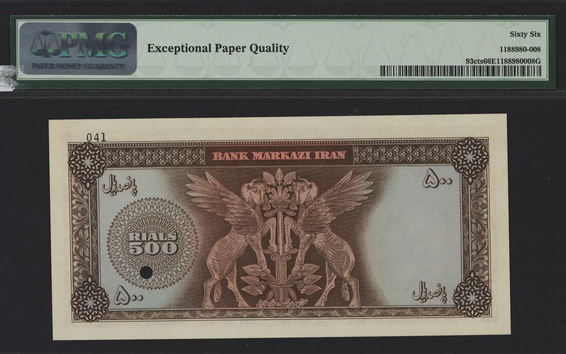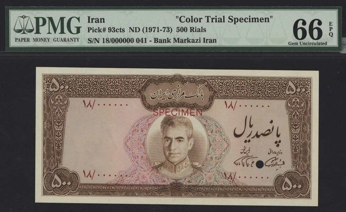 Bank Markazi Iran, colour trial specimen 500 rials, ND (1971-73), serial number 18/000000 041, (Pick 93cts), in PMG holder 66 EPQ Gem Uncirculated
