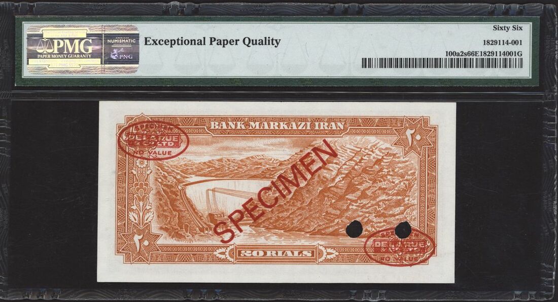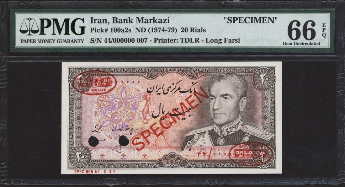 Bank Markazi Iran, specimen 20 rials, ND (1974-79), serial number 7, (Pick 100a2s), in PMG holder 66 EPQ Gem Uncirculated, only 10 notes in a higher grade