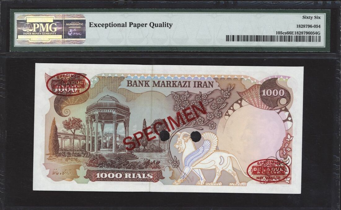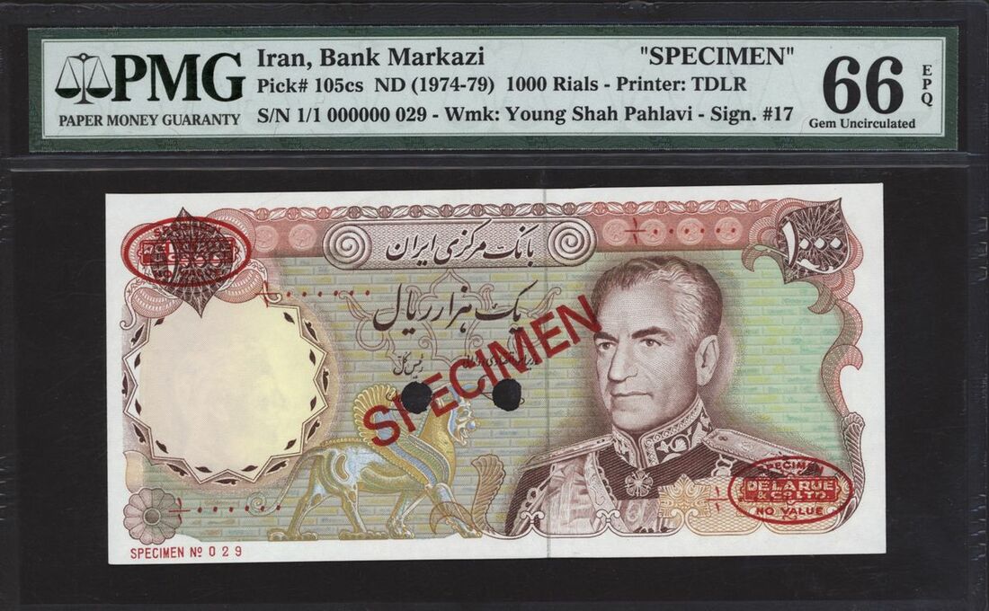 Bank Markazi Iran, specimen 1000 rials, ND (1974-79), serial number 1/1 000000 029, (Pick 105cs), in PMG holder 66 EPQ Gem Uncirculated, only 2 notes in a higher grade