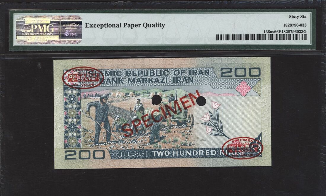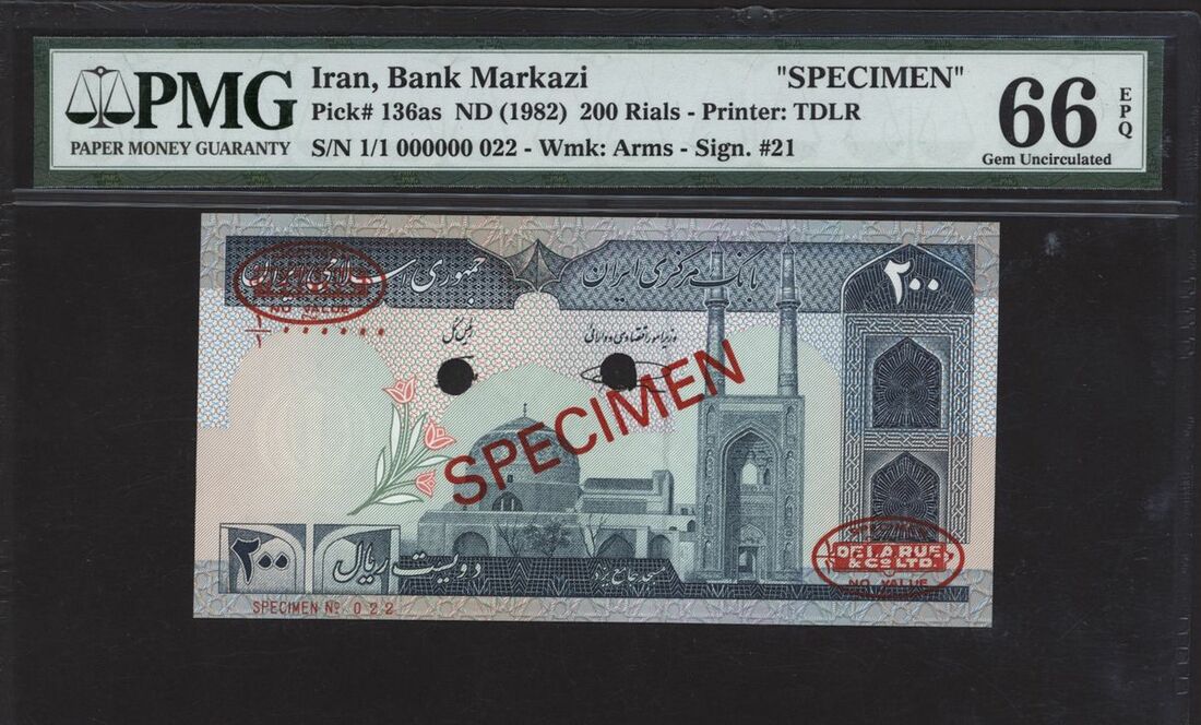 Bank Markazi Iran, specimen 200 rials, ND (1982), serial number 1/1 000000 022, (Pick 136as), in PMG holder 66 EPQ Gem Uncirculated, only 6 notes in a higher grade