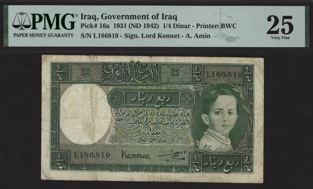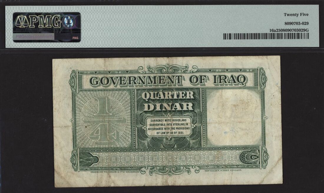 (x) Government of Iraq, 1/4 dinar, 1931 (ND 1942), serial number L186819, (Pick 16a), in PMG holder 25 Very Fine
