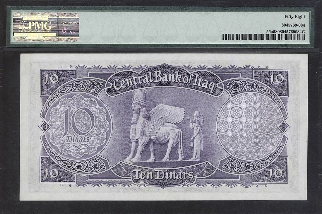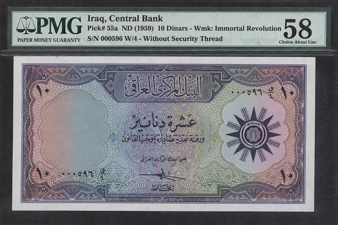 (x) Central Bank of Iraq, 10 dinars, ND (1959), serial number 000596 W/4, (Pick 55a), in PMG holder 58 Choice About Uncirculated
