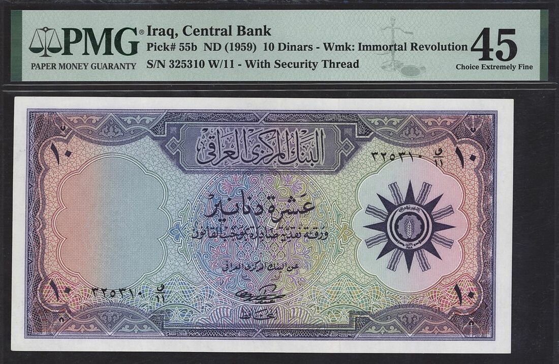 (x) Central Bank of Iraq, 10 dinars, ND (1959), serial number 325310, (Pick 55b), in PMG holder 45 Choice Extremely Fine