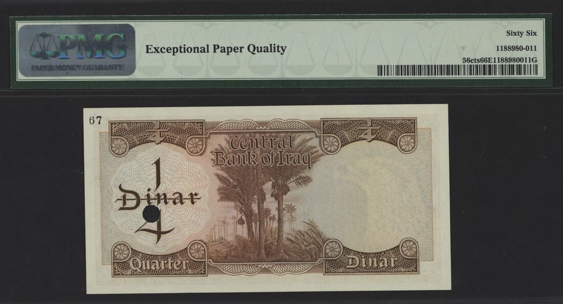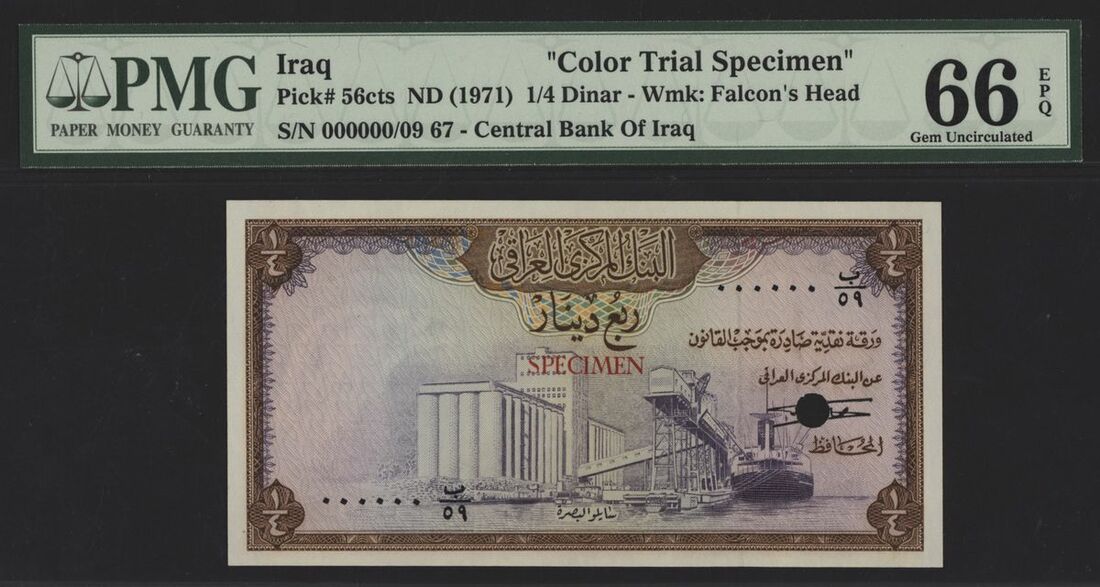 Central Bank of Iraq, colour trial specimen 1/4 dinar, ND (1971), serial number 000000/09 67, (Pick 56cts), in PMG holder 66 EPQ Gem Uncirculated