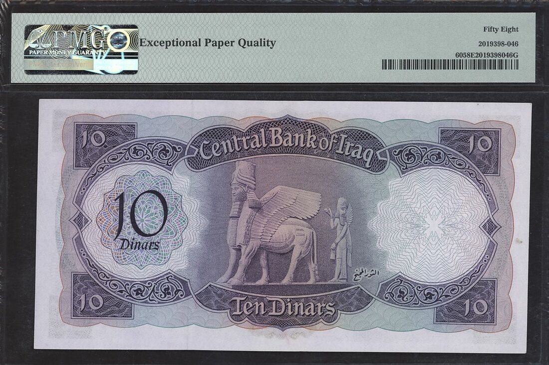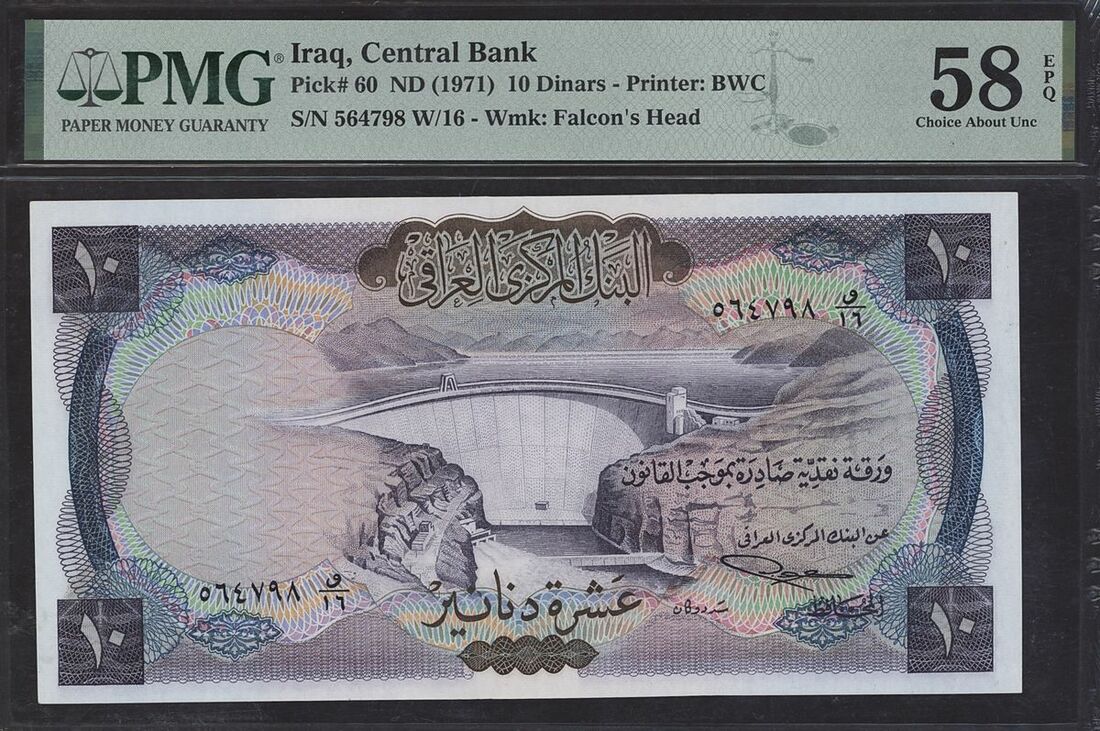 (x) Central Bank of Iraq, 10 dinars, ND (1971), serial number 564798, (Pick 60), in PMG holder 58 EPQ Choice About Uncirculated