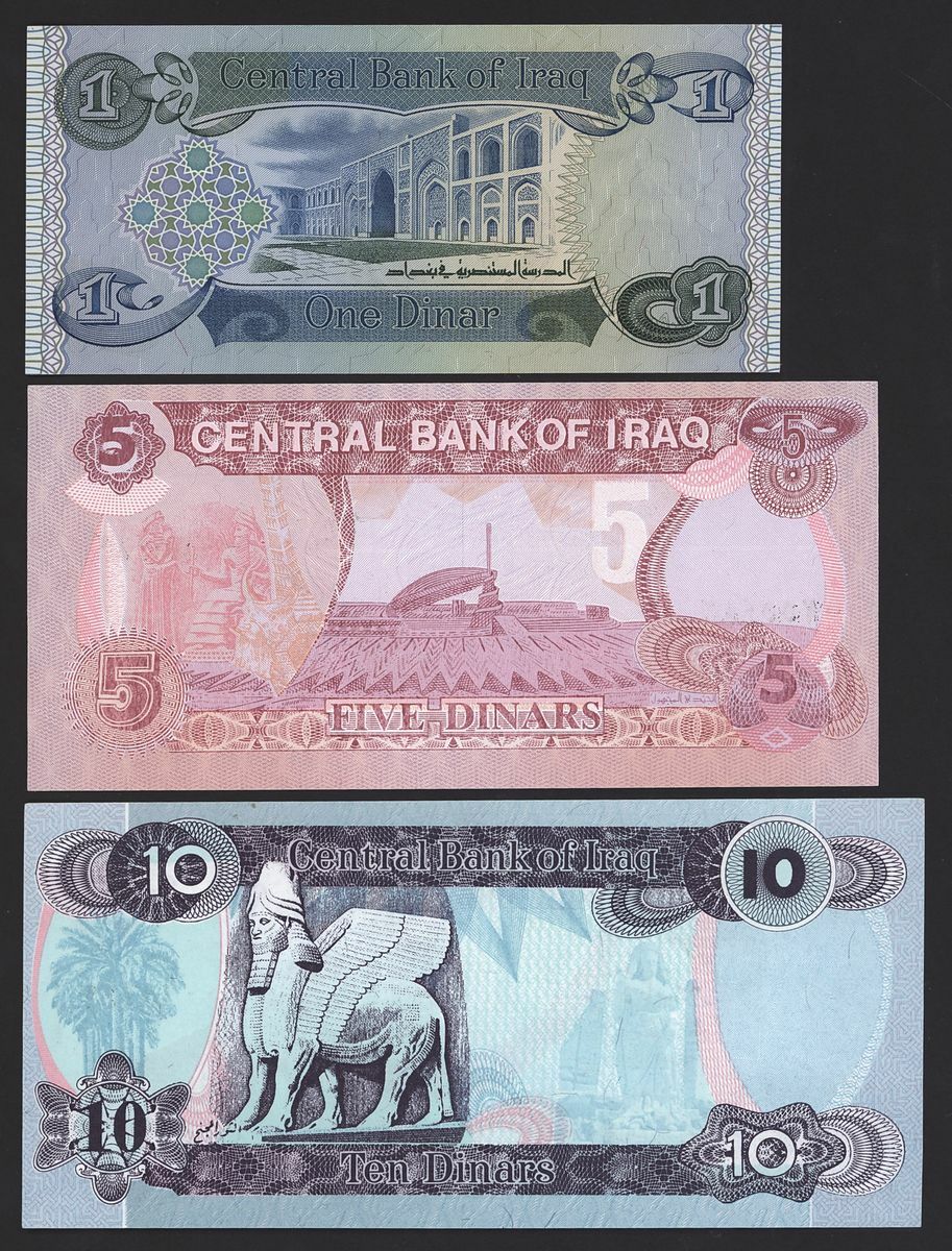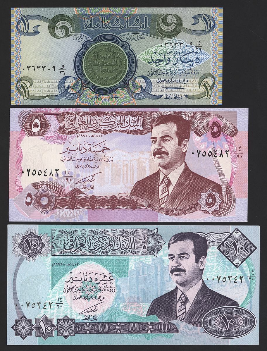 Central Bank of Iraq, a trio of notes, 1 dinar, 1979, 5 dinars, 1992, 10 dinars, 1992, (Pick 69, 80, 81), uncirculated