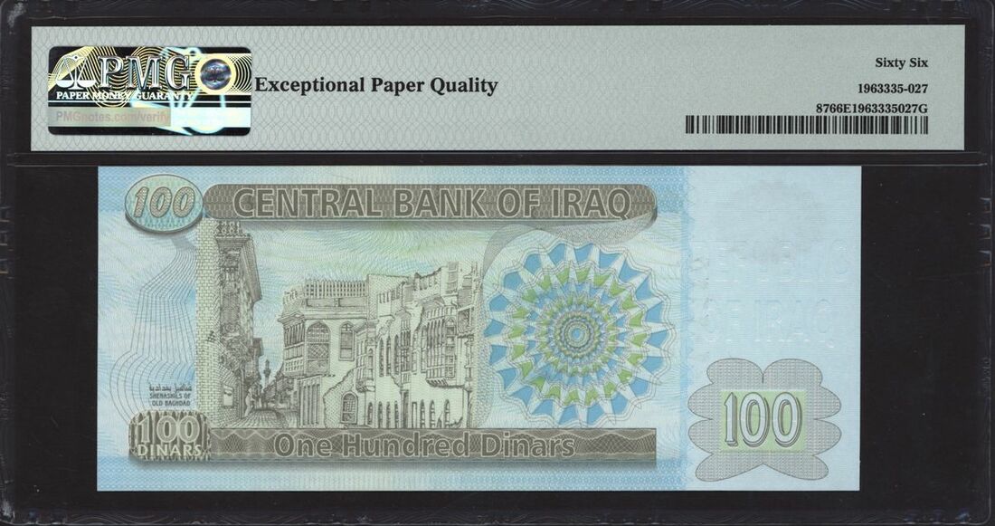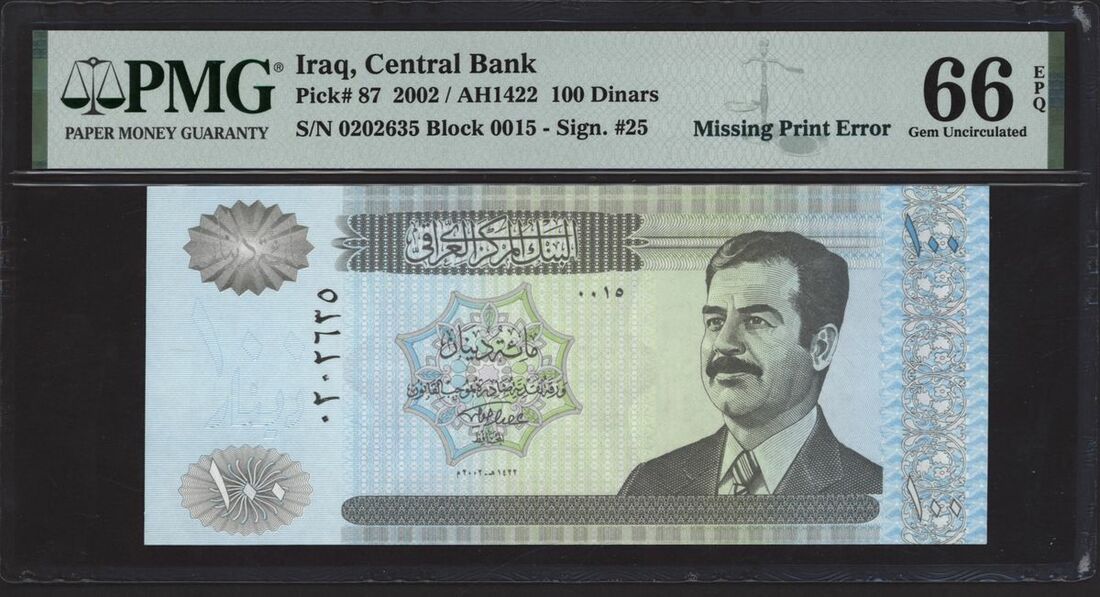 (x) Central Bank of Iraq, missing print error 100 dinars, 2002, serial number 0202635, (Pick 87), in PMG holder 66 EPQ Gem Uncirculated