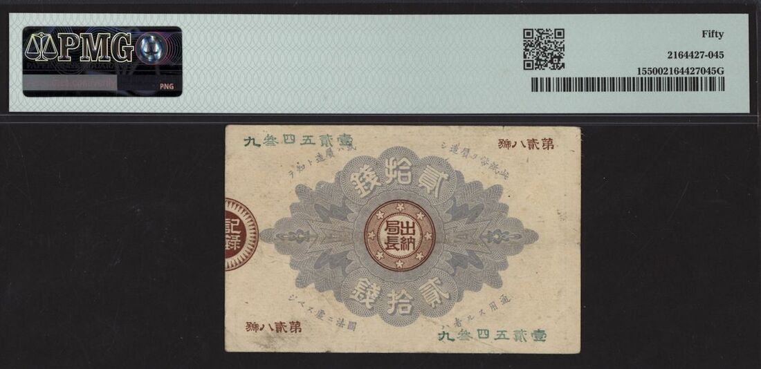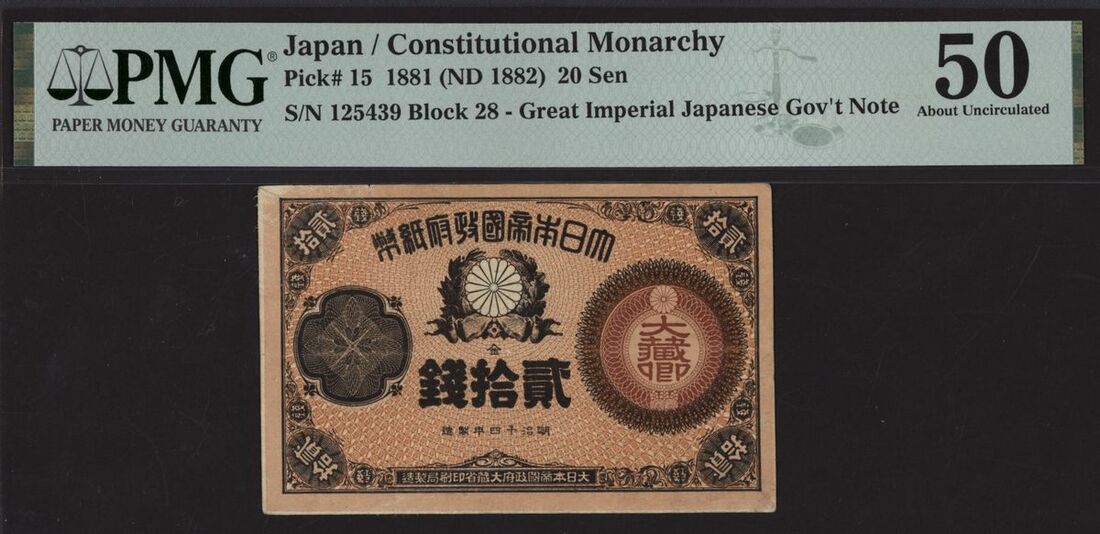 (x) Constitutional Monarchy, Japan, 20 sen, 1881 (ND 1882), serial number 125439, (Pick 15), in PMG holder 50 About Uncirculated