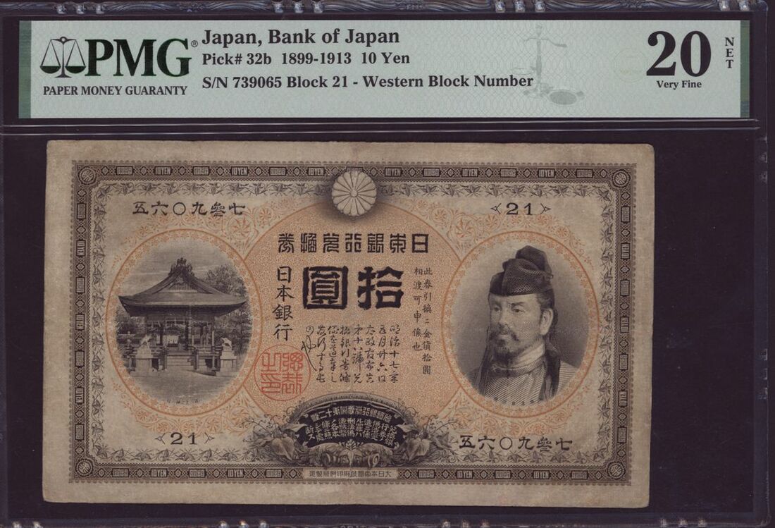 (x) Bank of Japan, 10 yen, 1899-1913, serial number 739065, (Pick 32b), in PMG holder 20 NET Very Fine, restoration