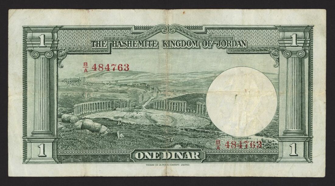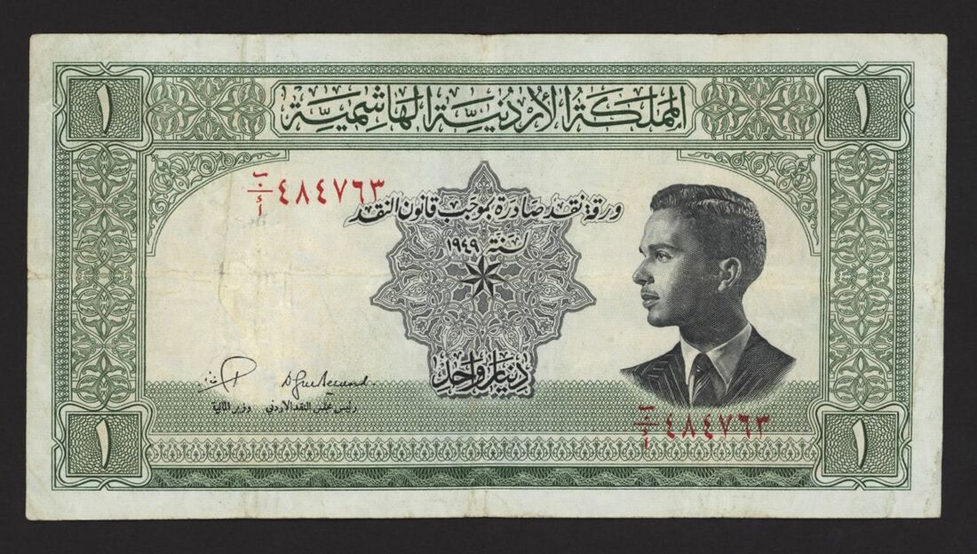 (x) Jordan Currency Board, 1 dinar, 1949 (ND 1952), serial number B/A 484763, (Pick 6a), fine