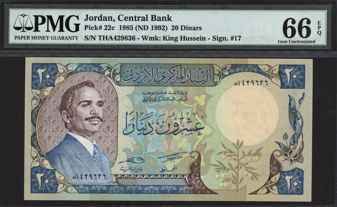 (x) Central Bank of Jordan, 20 dinars, 1985 (ND 1992), serial number THA429636, (Pick 22c), in PMG holder 66 EPQ Gem Uncirculated