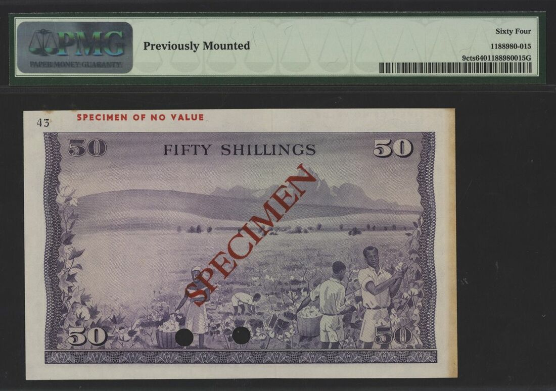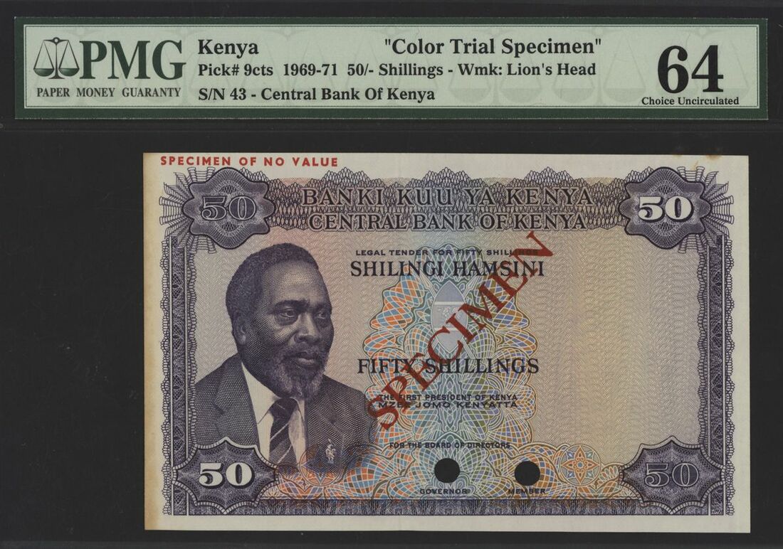 Central Bank of Kenya, colour trial specimen 50 shillings, ND (1969-71), serial number 43, (Pick 9cts), in PMG holder 64 Choice Uncirculated, previously mounted